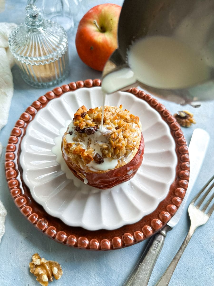 Upieczone jabłka śniadaniowe możesz polać słodką śmietanką. Tym, którzy lubią zaszaleć polecam odrobinę bitej śmietany albo gęsty jogurt wymieszany z miodem. Owsianka pieczona w jabłkach świetnie smakuje także w towarzystwie syropy klonowego.