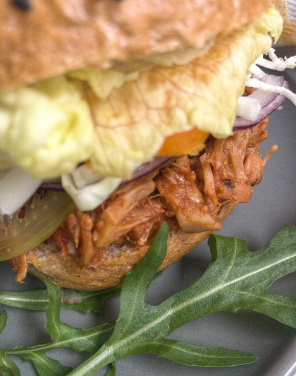 Wegański burger z “szarpaną wieprzowiną to dobry pomysł na początek przygody z chlebowcem. Do tego Wasze ulubione dodatki i hit sezonu gotowy.
