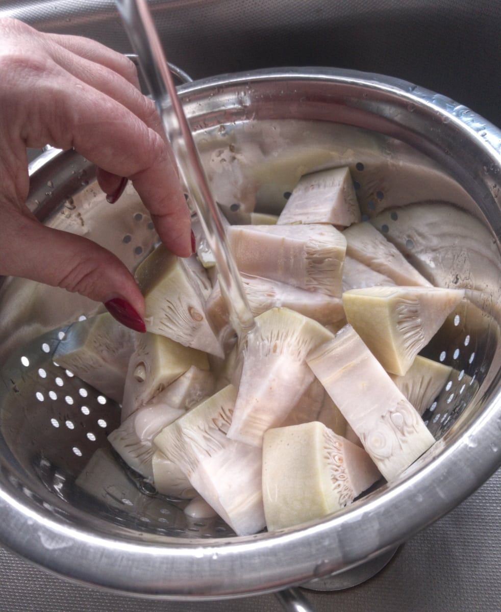 • Cebulę pokrój w drobną kostkę, czosnek przeciśnij przez praskę. Owoc chlebowca odcedź z zalewy, dobrze wypłucz pod bieżącą wodą i dobrze odciśnij z płynu. Usuń twarde części i nasiona. Pokrój wzdłuż włókien na mniejsze kawałki.