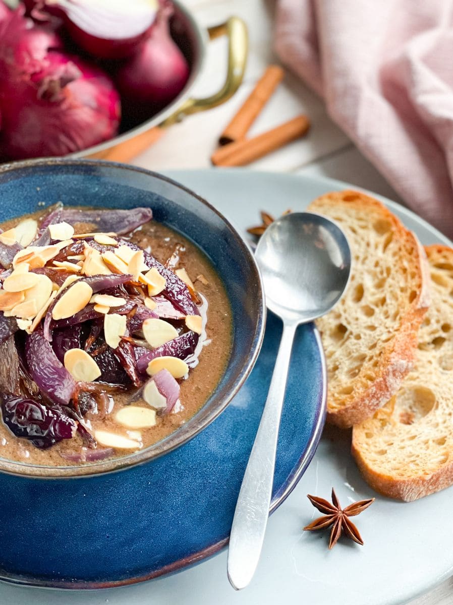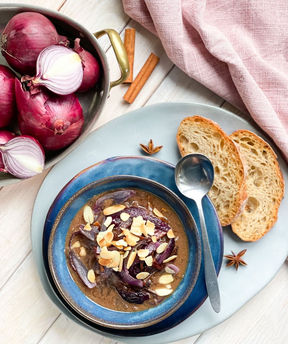Sporu między Francuzami a ich włoskimi przyjaciółmi rozstrzygnać się pewnie nie uda. I może nie warto, bo i włoska i francuska wersja jest pyszna. Toskańska zupa z czerwonej cebuli zaskoczy was smakiem – sporo w niej cynamonu, goździków, anyżu i gałki. Choć taki zestaw przypraw zupełnie nie pasuje do współczesnej włoskiej kuchni to właśnie tak gotuje się tę zupę od wieków. I od wieków – zagęszcza się ją sporą porcją mielonych migdałów.